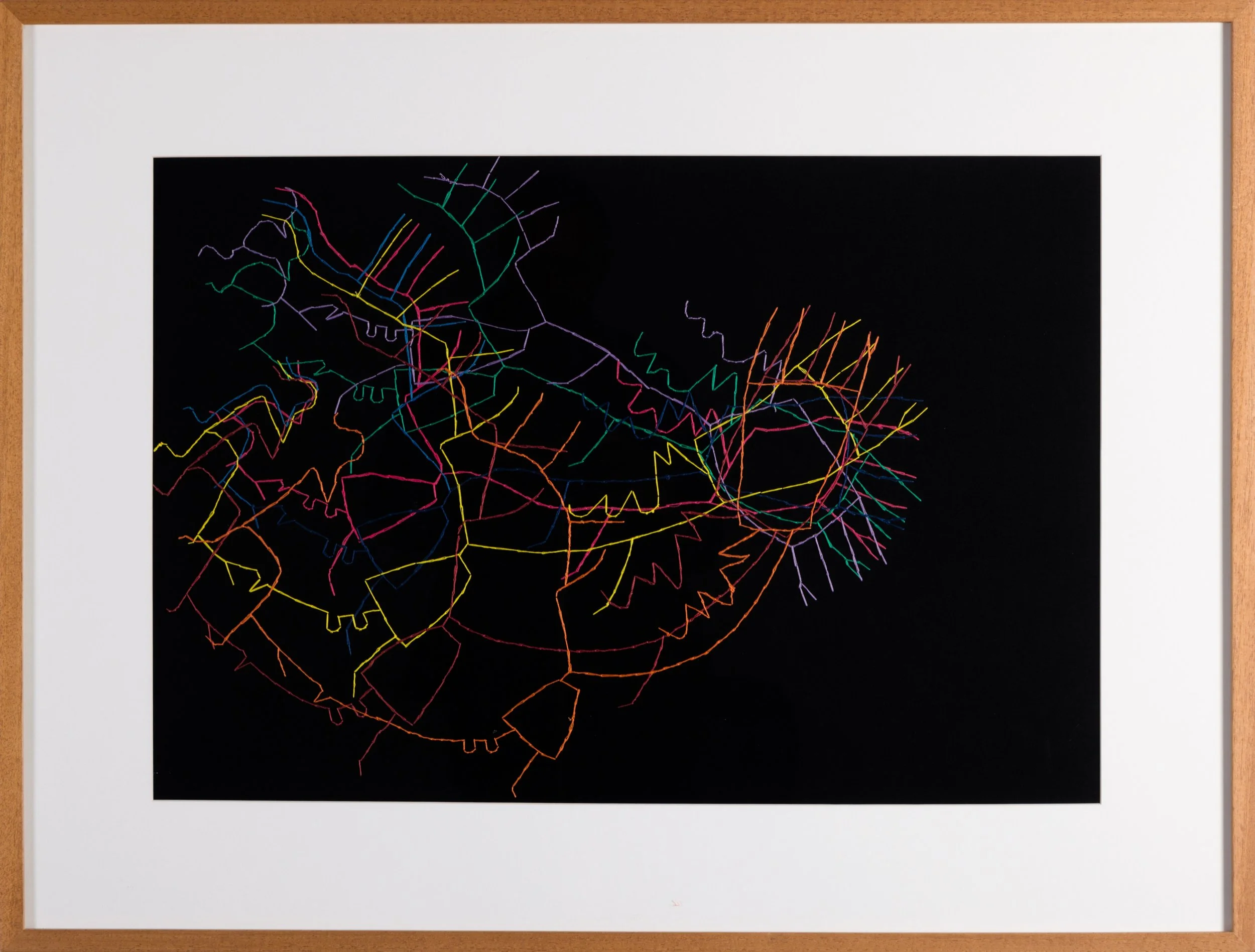 In this composition, vividly embroidered lines intricately outline the underwater borders that divide ownership of space beneath the Mediterranean Sea. The artwork invites reflection on the agendas behind socially constructed land and offshore borders, shedding light on the strategic division of resources—particularly the oil and gas reserves off the coast of Lebanon. Moreover, it poses poignant questions about the responsibility for lives lost at sea during the perilous journeys made by migrants across these passageways as governing forces shy away from accountability.
