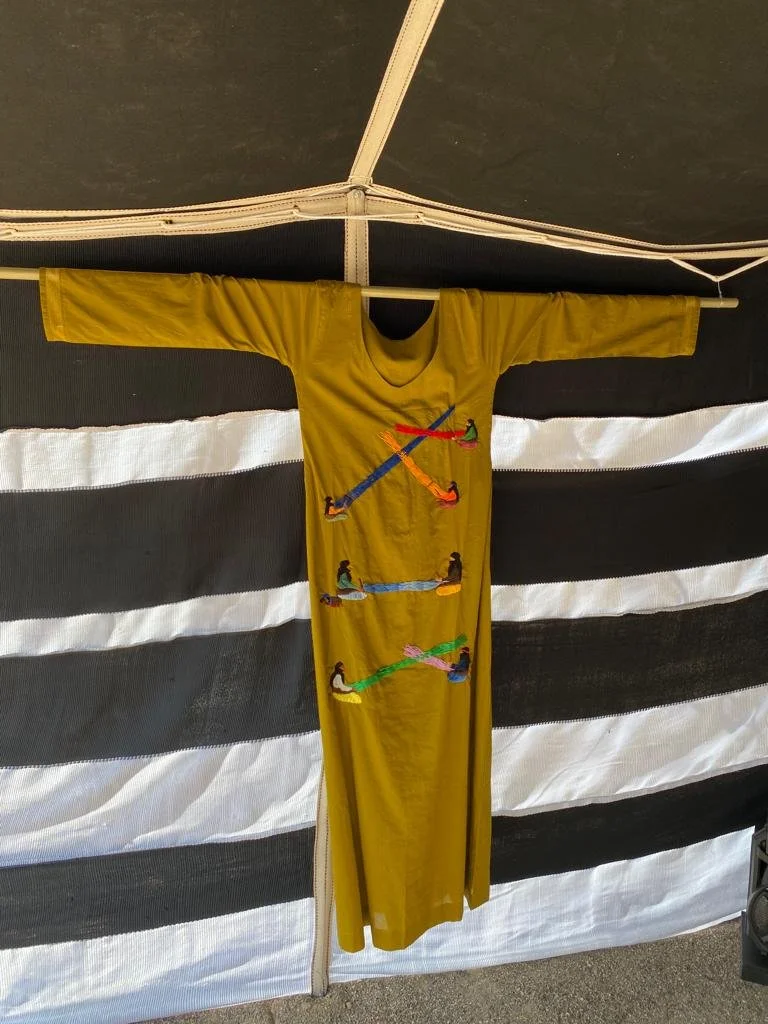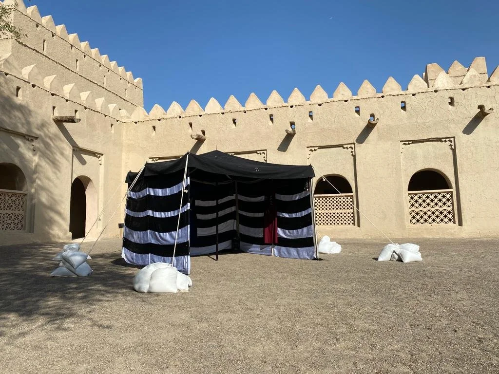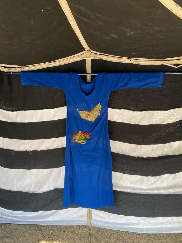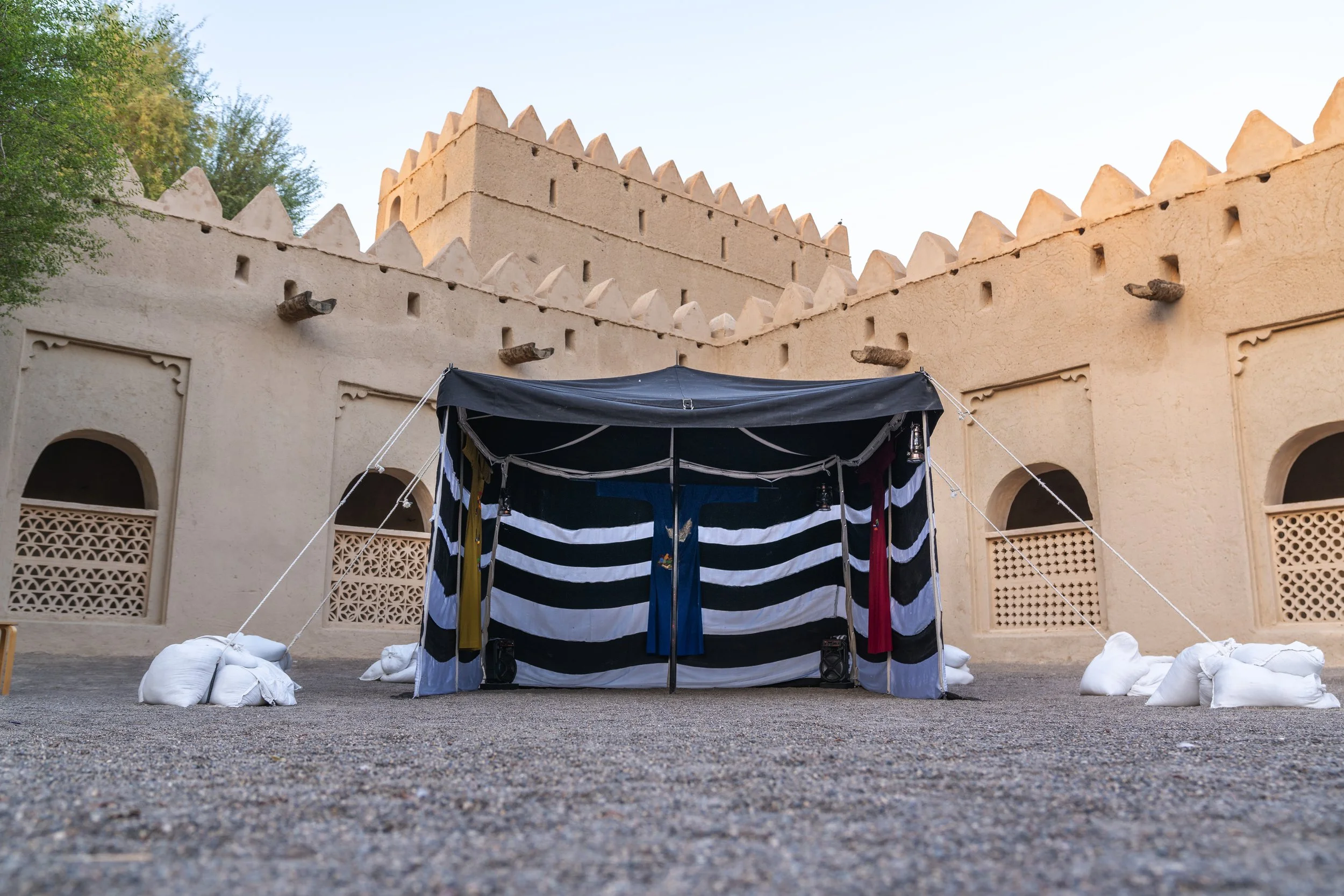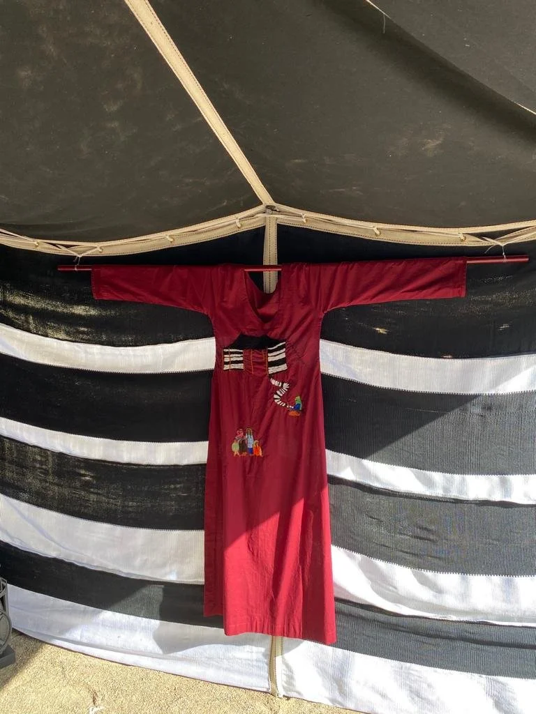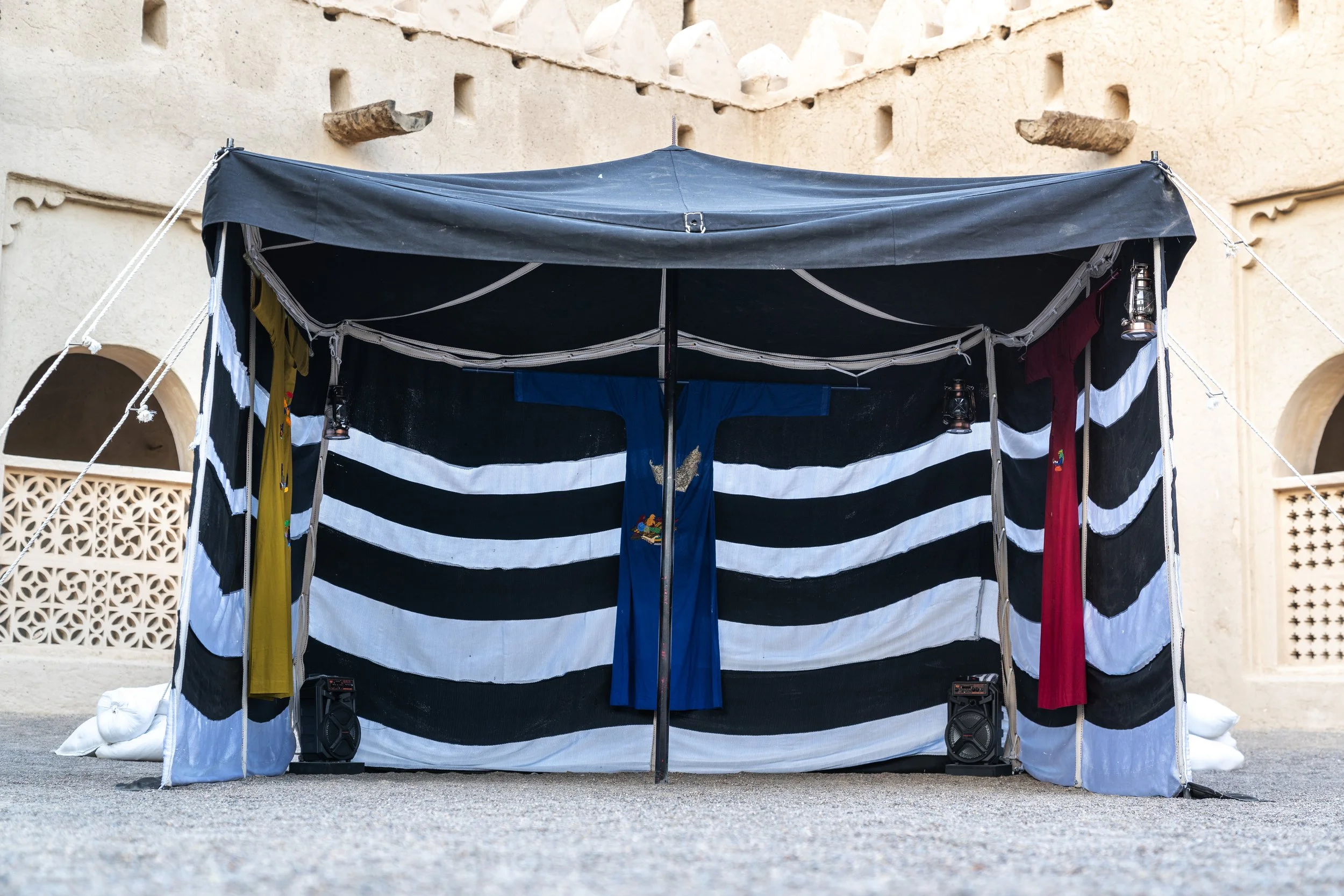 Dwelling On The Past is a large scale public artwork, commissioned by Abu Dhabi Art, which reimagines the Bedouin Al-Sadu tent using black-and-white plastic, blending traditional weaving with modern petroleum-era materials. Inside, three embroidered dresses honour Bedouin women's roles as creators and leaders. This installation reclaims heritage, subverts material norms, and reflects shifting cultural identities through craft, memory, and symbolic spatial design.