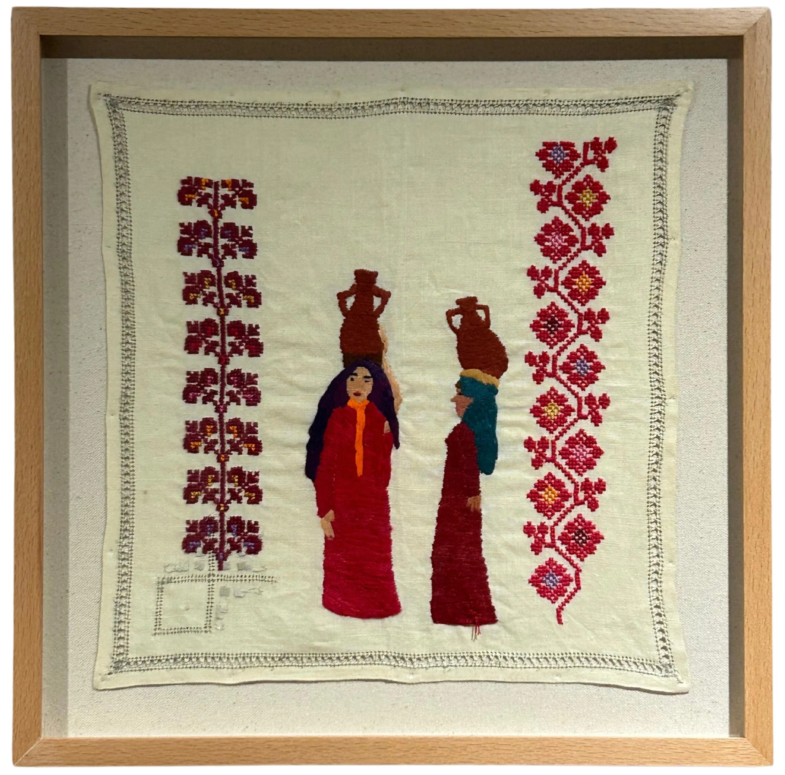 The collection of water, carried in traditional clay pots, is our right to a natural resource that flows through our lands and is constantly under threat of being cut off or polluted. This is overlayed with traditional tatreez of various flowers that grow along the banks of the rivers where water is collected, highlighting the beauty and wilderness of our land.