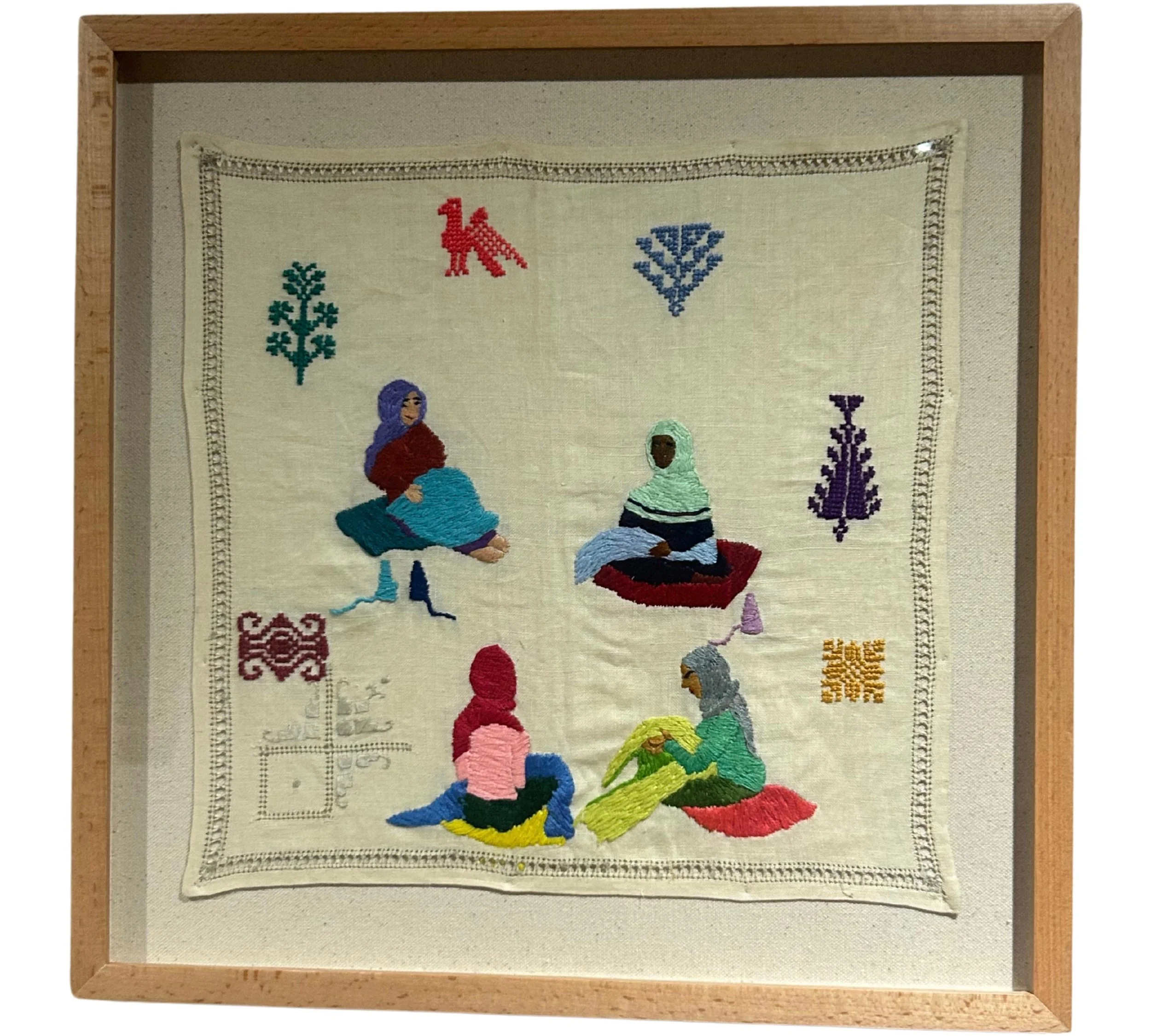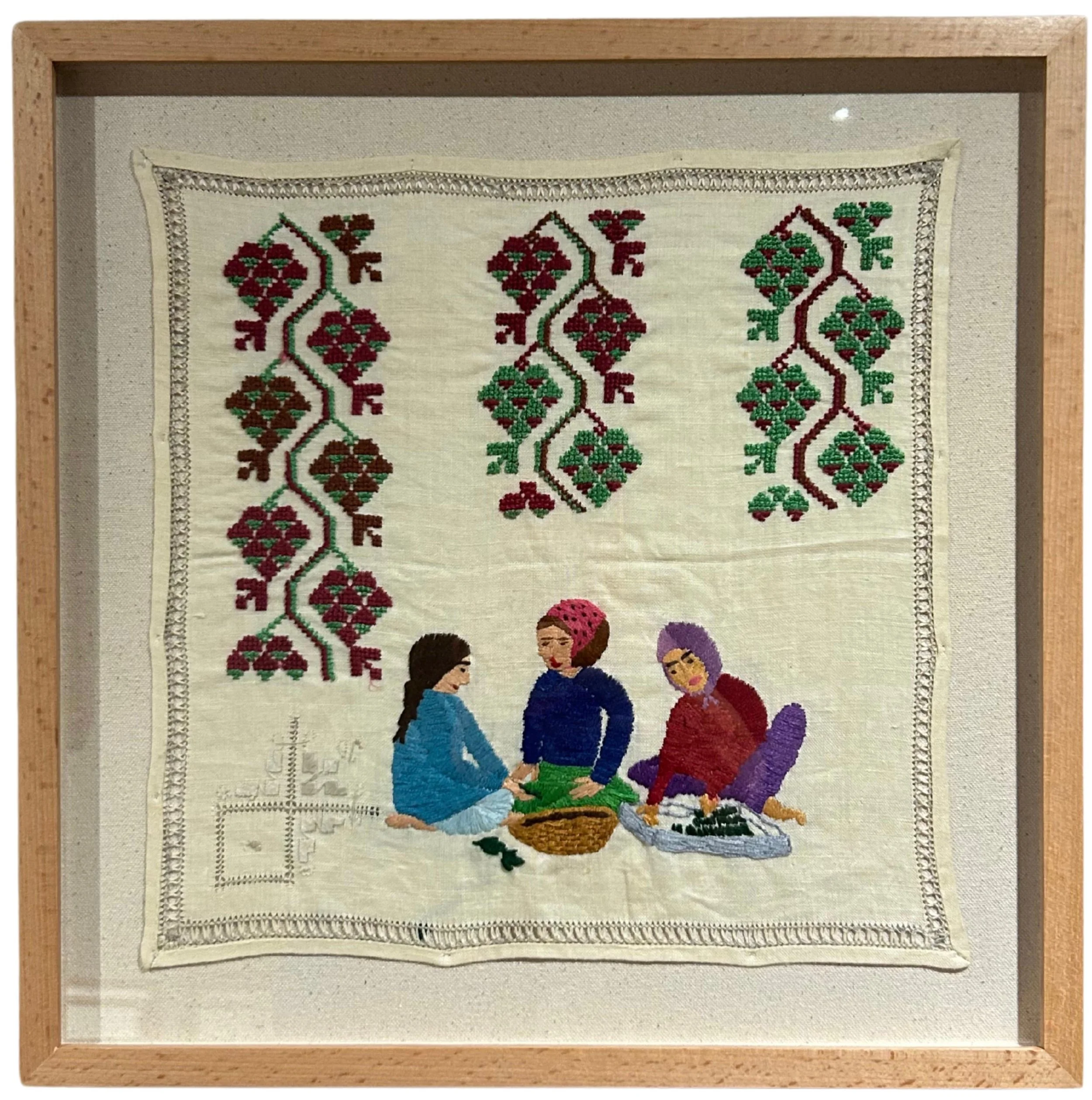 Cooking traditional recipes, using ingredients harvested from our land and the passing down of recipes from generations reinforces the matrilineal lineage from the hands of grandmothers to mothers. This forms part of our cultural identity which roots us to our families and our region. The women depicted in this scene are wrapping vine leaves [warak enab] and are overlayed with the traditional cross-stitch of vine leaves framing the image.