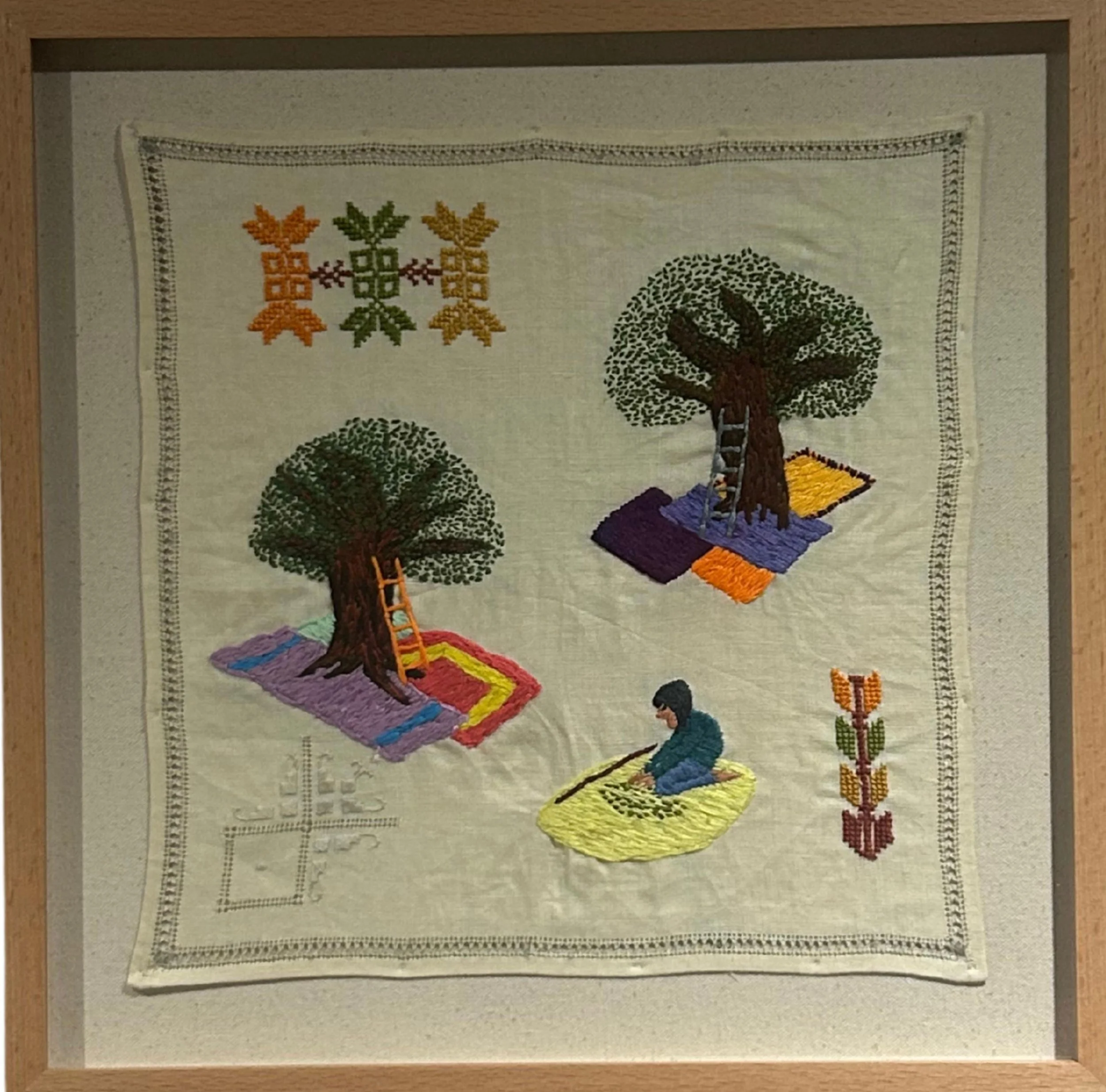 Tatreez is the traditional embroidery which is the ultimate act of defiance. Each region of Palestine has its own unique style and motif. As women sit and stitch together as a collective, stories are shared and traditions of stitch preserved for generations to come. Here, the image is encircled by a selection of typical motifs from a different region of Palestine