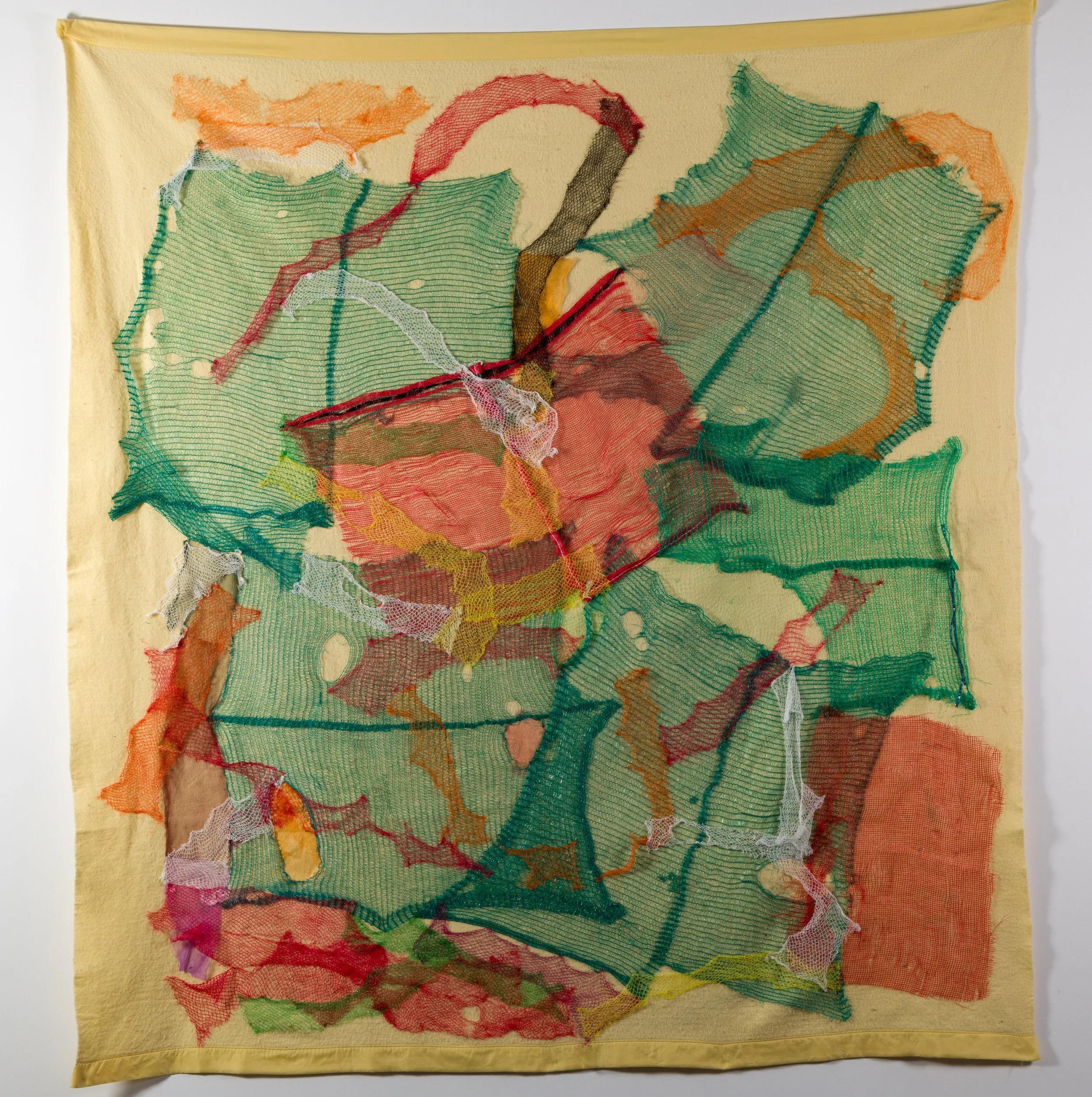 In Trade Routes, the mundane is rendered magnanimous. A vibrant and painterly composition emerges from a tapestry of upcycled produce nets, felted and stitched onto a British wool blanket, prompting contemplation on cross-border flows, globalisation, human movement, trade and migrant labour.